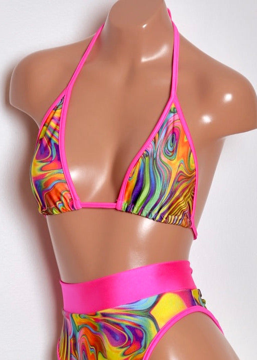 Acid Swirl Triangle Bikini Top with Rings and Black Trim