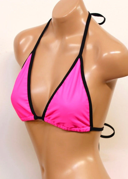 Dive into summer style with this eye-catching neon pink triangle bikini top featuring bold black trim. Built from flexible 4-way stretch tricot spandex, it's...