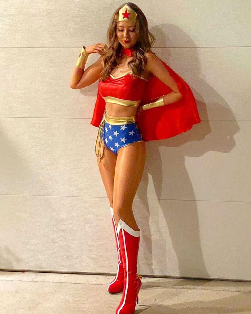 Superheroines unite!! This set comes with a long sleeve crop top with a scoop neckline which gives great cleavage and official Super Hero patch.The bottoms...